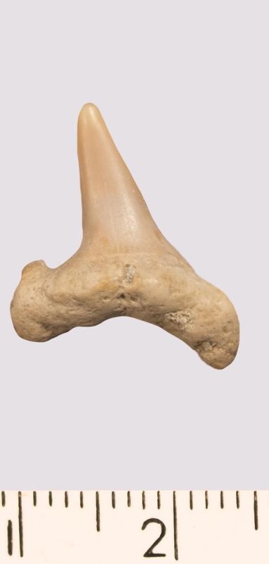 Зуб. Акула. Scapanorhynchus gigas Woodward, 1889. Классификация: Хордовые Chordata, Позвоночные Vertebrata, Хрящевые рыбы Chondrichthyes, Пластиножаберные Elasmobranchii