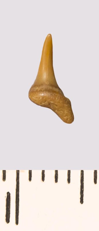 Зуб. Акула. Scapanorhynchus rhaphiodon Agassiz, 1843. Классификация: Хордовые Chordata, Позвоночные Vertebrata, Хрящевые рыбы Chondrichthyes, Пластиножаберные Elasmobranchii