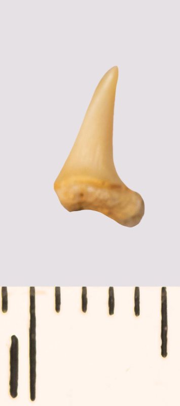 Зуб. Акула. Scapanorhynchus rhaphiodon Agassiz, 1843. Классификация: Хордовые Chordata, Позвоночные Vertebrata, Хрящевые рыбы Chondrichthyes, Пластиножаберные Elasmobranchii