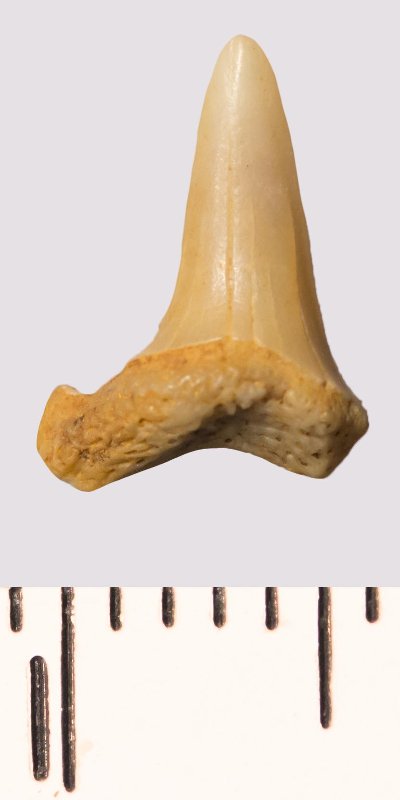 Зуб. Акула. Scapanorhynchus rhaphiodon Agassiz, 1843. Классификация: Хордовые Chordata, Позвоночные Vertebrata, Хрящевые рыбы Chondrichthyes, Пластиножаберные Elasmobranchii