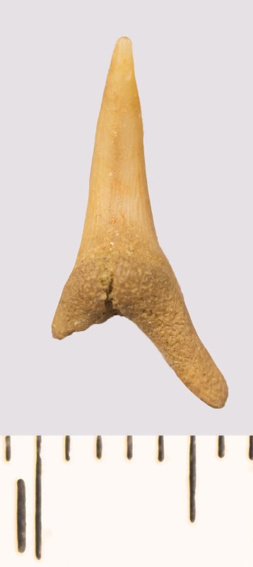 Зуб. Акула. Scapanorhynchus rhaphiodon Agassiz, 1843. Классификация: Хордовые Chordata, Позвоночные Vertebrata, Хрящевые рыбы Chondrichthyes, Пластиножаберные Elasmobranchii