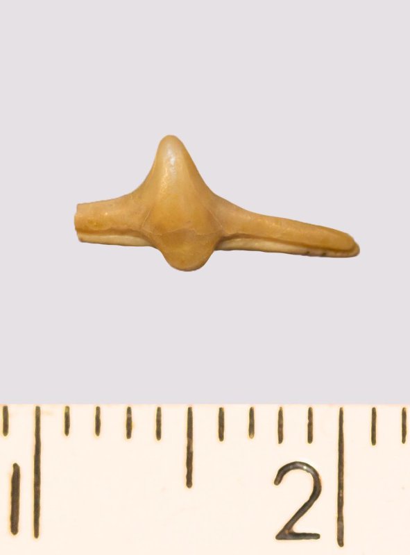 Зуб. Акула. Squatina sp. Классификация: Хордовые Chordata, Позвоночные Vertebrata, Хрящевые рыбы Chondrichthyes, Пластиножаберные Elasmobranchii