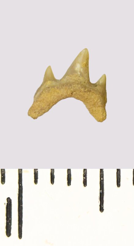 Зуб. Акула. Scapanorhynchus rhaphiodon Agassiz, 1843. Классификация: Хордовые Chordata, Позвоночные Vertebrata, Хрящевые рыбы Chondrichthyes, Пластиножаберные Elasmobranchii