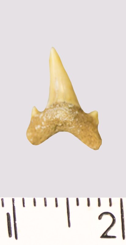 Зуб. Акула. Odontaspis macrorhiza (Cope) Leriche, 1902. Классификация: Хордовые Chordata, Позвоночные Vertebrata, Хрящевые рыбы Chondrichthyes, Пластиножаберные Elasmobranchii