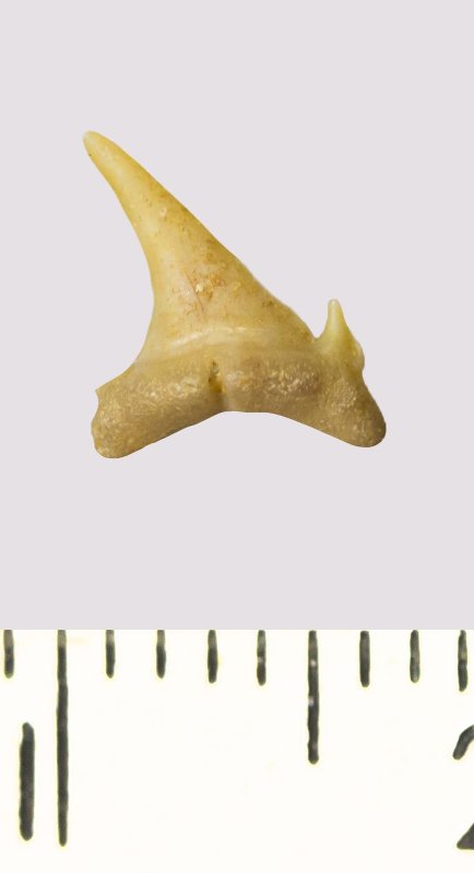 Зуб. Акула. Scapanorhynchus rhaphiodon Agassiz, 1843. Классификация: Хордовые Chordata, Позвоночные Vertebrata, Хрящевые рыбы Chondrichthyes, Пластиножаберные Elasmobranchii