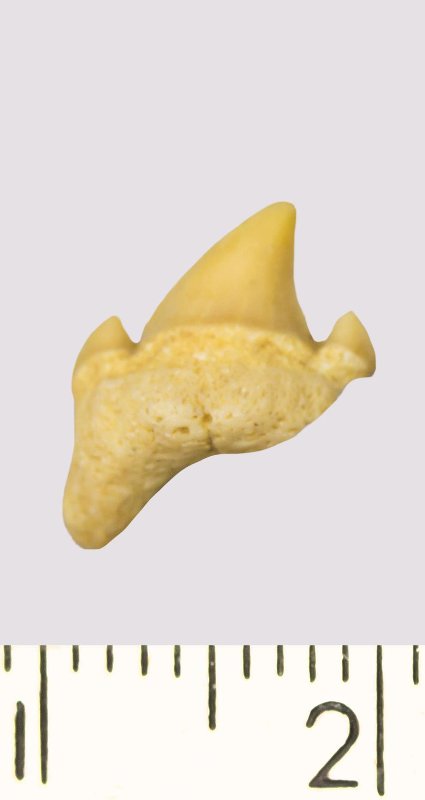 Зуб. Акула. Odontaspis macrorhiza (Cope) Leriche, 1902. Классификация: Хордовые Chordata, Позвоночные Vertebrata, Хрящевые рыбы Chondrichthyes, Пластиножаберные Elasmobranchii