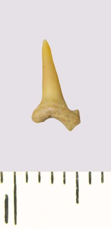 Зуб. Акула. Scapanorhynchus rhaphiodon Agassiz, 1843. Классификация: Хордовые Chordata, Позвоночные Vertebrata, Хрящевые рыбы Chondrichthyes, Пластиножаберные Elasmobranchii