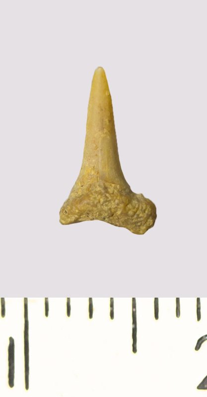 Зуб. Акула. Scapanorhynchus rhaphiodon Agassiz, 1843. Классификация: Хордовые Chordata, Позвоночные Vertebrata, Хрящевые рыбы Chondrichthyes, Пластиножаберные Elasmobranchii