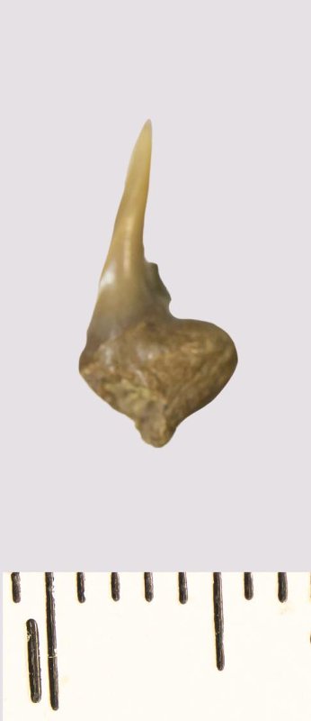 Зуб (фрагмент). Акула. Odontaspis macrorhiza (Cope) Leriche, 1902. Классификация: Хордовые Chordata, Позвоночные Vertebrata, Хрящевые рыбы Chondrichthyes, Пластиножаберные Elasmobranchii