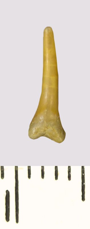 Зуб. Акула. Scapanorhynchus rhaphiodon Agassiz, 1843. Классификация: Хордовые Chordata, Позвоночные Vertebrata, Хрящевые рыбы Chondrichthyes, Пластиножаберные Elasmobranchii