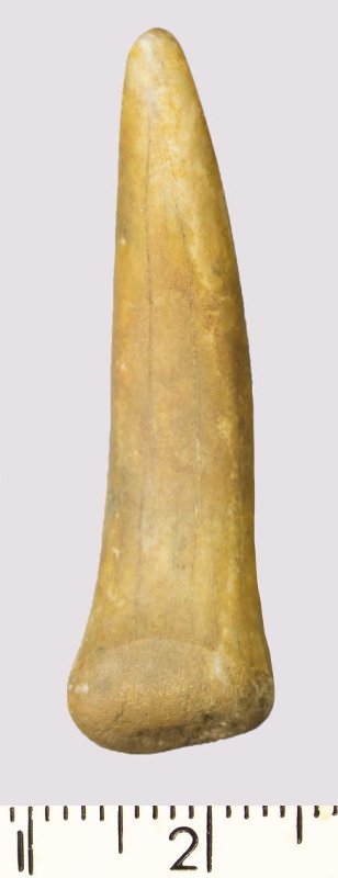 Зуб (фрагмент). Акула. Scapanorhynchus gigas Woodward, 1889. Классификация: Хордовые Chordata, Позвоночные Vertebrata, Хрящевые рыбы Chondrichthyes, Пластиножаберные Elasmobranchii