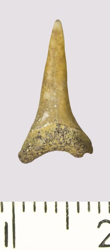 Зуб. Акула. Odontaspis striatula Dalinkevicius, 1935. Классификация: Хордовые Chordata, Позвоночные Vertebrata, Хрящевые рыбы Chondrichthyes, Пластиножаберные Elasmobranchii