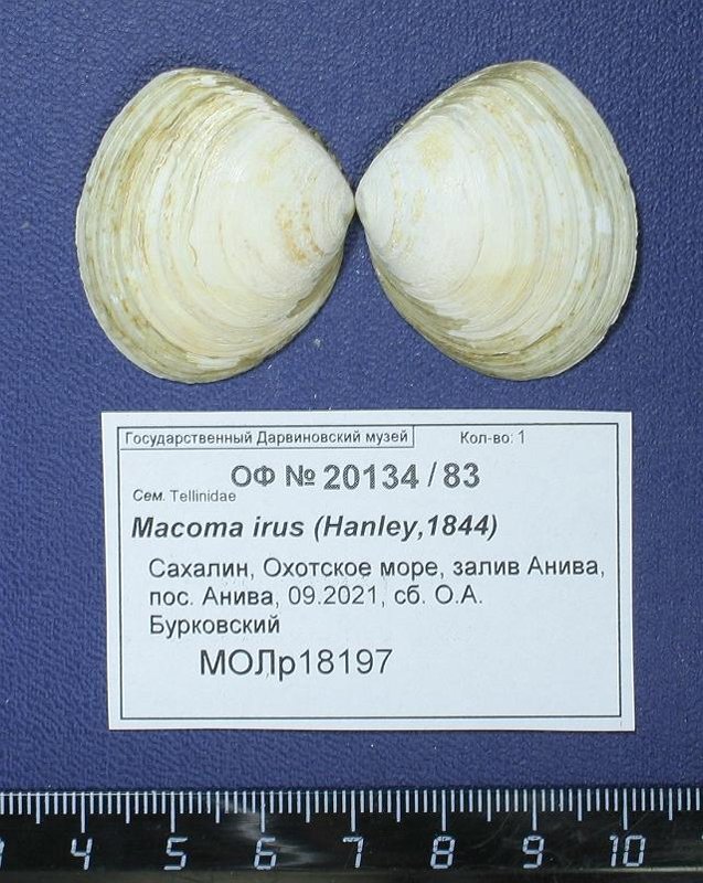 морской двустворчатый моллюск. Macoma irus (Hanley,1844), Tellinidae. Классификация: Моллюски Mollusca, Двустворчатые моллюски Bivalvia