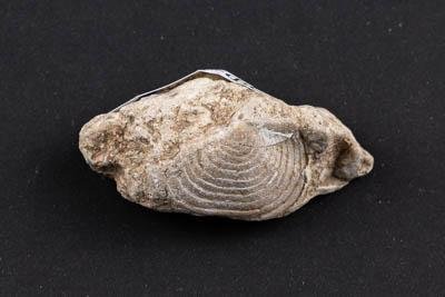 Раковина брахиоподы на субстрате. У раковины четко различимы линии нарастания. Субстрат представлен плотным кристаллическим известняком молочно-белого цвета.