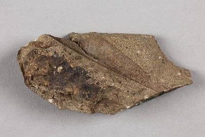 Отпечаток листа хвойного на породе. Лист ланцетовидный, жилки расходятся веером. Порода представлена крепко сцементированным среднезернистым песчаником серого цвета.