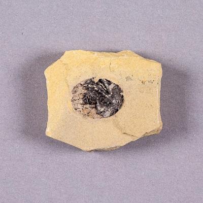Семя гинкгового в породе. Порода представлена плотным алевролитом бежевого цвета.