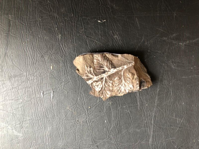 Образец неправильной формы, представляет собой фрагмент керна скважины. Многочисленные отпечатки вайи папоротников с фитолеймами на породе. На вайях сохранились сорусы. Порода представляет собой алевролит глинистый, зеленовато-серого цвета.