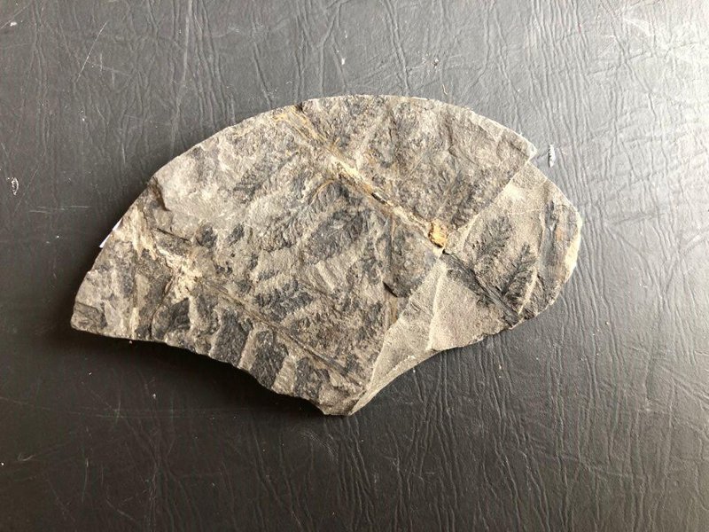 Образец неправильной формы, представляет собой фрагмент керна скважины. Многочисленные отпечатки вайи папоротников с фитолеймами на породе. Вайи стерильные. Порода представляет собой алевролит глинистый, зеленовато-серого цвета.