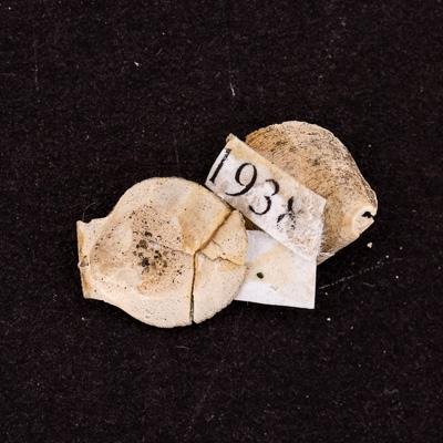 Округлая створка раковины с приостренной макушкой и четко выраженными ушками. Правая створка. Скульптура в виде четко выраженных концентрических ребрышек. Цвет молочно-белый.