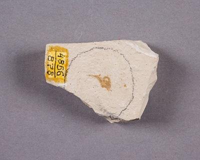 Отпечаток таллома водоросли в образце мергеля неправильной формы. Таллом пластинчатый, на ножке, рассечен на симметричные доли, лопасти с более мелкими лопастями второго порядка. Мергель плотный, светло-бежевого цвета. Отпечатки выделяются на фоне породы более темной окраской.