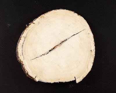 Поверхности спила расположены под углом друг к другу - с одной стороны толщина спила намного выше. Почти целый поперечный двусторонний срез (спил) бивня мамонта молочно-желтого цвета с частично сохранившейся внешней поверхностью бивня неравномерного темно-коричневого цвета.