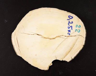 Бивень рассохся. С одной стороны спил грубый, неровный, с другой - относительно гладкий, вероятно, полированный. На спиле четко различимы линии Шрегера. Возраст: ad