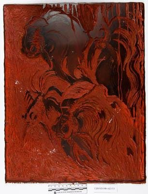 Доска из комплекта (3 доски). Вер-тикальный фор-мат. Среди растений изображены 4 рыбки-вуалехвостки боком головой влево попарно. Красный тон. Доска к линогравюре «Золотые рыбки» (ОФ-10238).