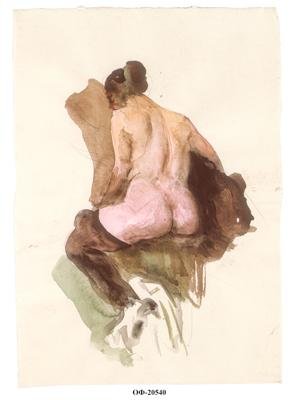 На листе вертикального формата - акварельный этюд, изображающий сидящую обнаженную натурщицу в черных чулках, вид со спины. Женщина сидит на покрытом коричнево-зеленой драпировкой стуле. Темные волосы модели собраны в узел на затылке, лицо не видно.
