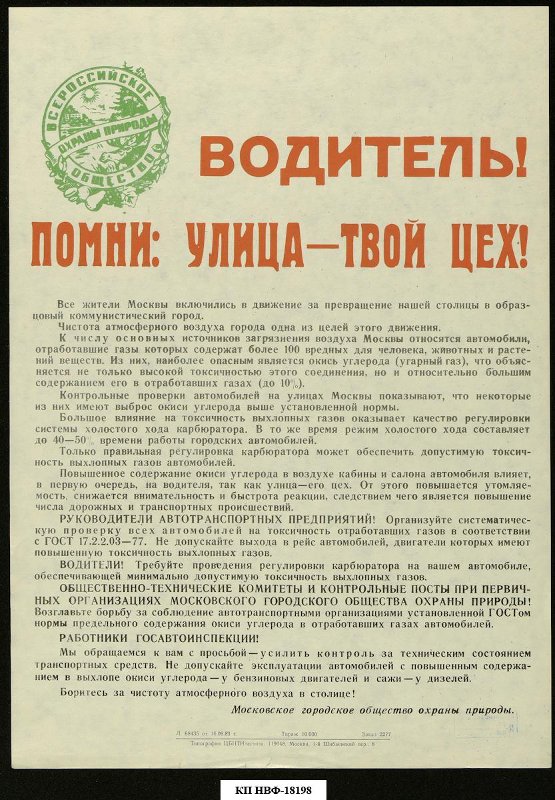 Агитационная листовка с текстом. Основной текст напечатан черным шрифтом. Текст названия - красным шрифтом. В левом верхнем углу зеленой краской напечатана эмблема ВООП.
