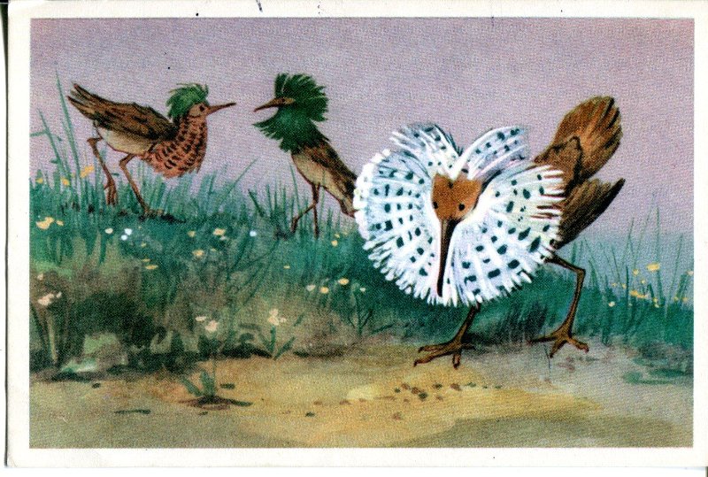 Открытка горизонтального формата с изображением трёх турухтанов в пейзаже. Один изображен крупно справа на первом плане.
