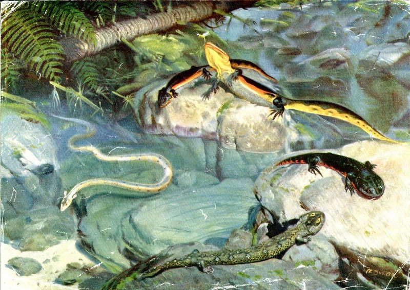 На листе горизонтального формата изображен лесной водоём с валунами и древовидными папоротниками в зеленовато-голубоватых тонах. В водоёме и на валунах изображены разнообразные панцирноголовые земноводные. Вверху слева поваленный ствол, правее на валуне два земноводных с желто-рыжим брюшком. Справа на валунах два пестрых круглоголовых земноводных. Слева в водоёме светлая "змейка".