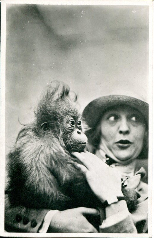 Актриса Уши Элеот и детеныш-орангутан "Буши". Серия "Семья орангутанов. Дрезденский зоологический сад". Открытка