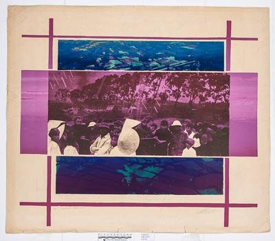 На листе горизонтального формата три цветных прямоугольника. На центральном прямоугольнике розового цвета изображение сельского пейзажа. На первом плане толпа людей, светлые элементы одежды акцентированы белым цветом, за ними трактор. На горизонте лесополоса. На нижнем прямоугольнике фиолетового цвета брусчатка. На верхнем прямоугольнике синего цвета плитка в шахматном порядке. Изображение стилизовано и заключено в рамку из малиновых полос.