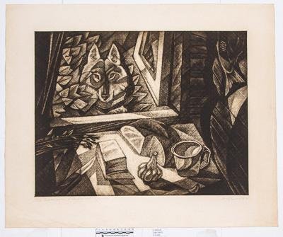 На листе горизонтального формата изображен натюрморт и морда собаки в окне. На переднем плане стол. На столе: половинка буханки хлеба, кружка, чеснок (головка), кусок сала, нож, ветки травы. Справа вверху на стене сушеная рыба. На втором плане окно, раскрытое настежь, в окне собака в кустах.