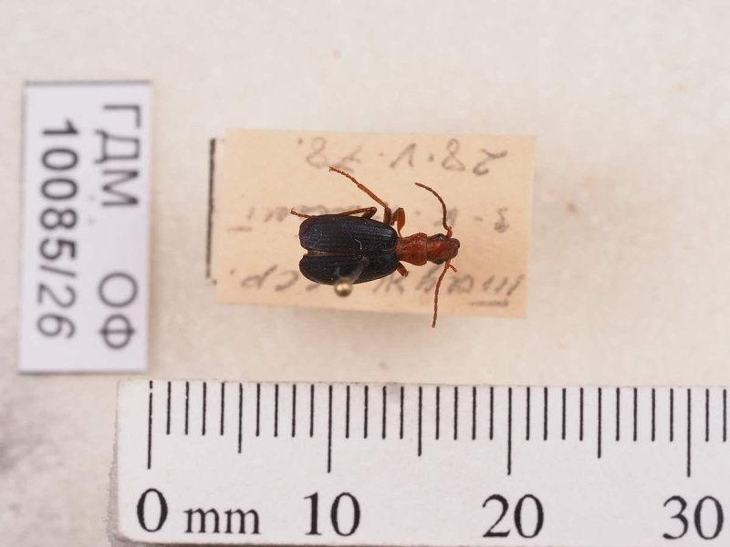 Сухое насекомое. Жук бомбардир. Brachinus brevicollis Motschulsky, 1844. Классификация: Членистоногие Arthropoda, Насекомые Insecta, Жуки Coleoptera, Жужелицы Carabidae