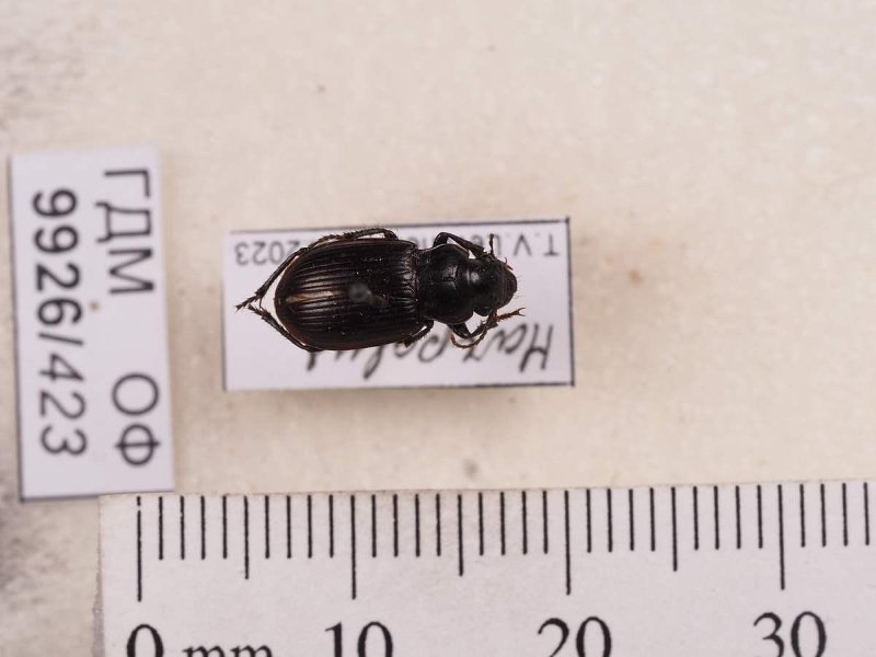 Сухое насекомое. Жук птеростих. Harpalus. Классификация: Членистоногие Arthropoda, Насекомые Insecta, Жуки Coleoptera, Жужелицы Carabidae, Carabus, Жук C. coriaceus Linne, 1758