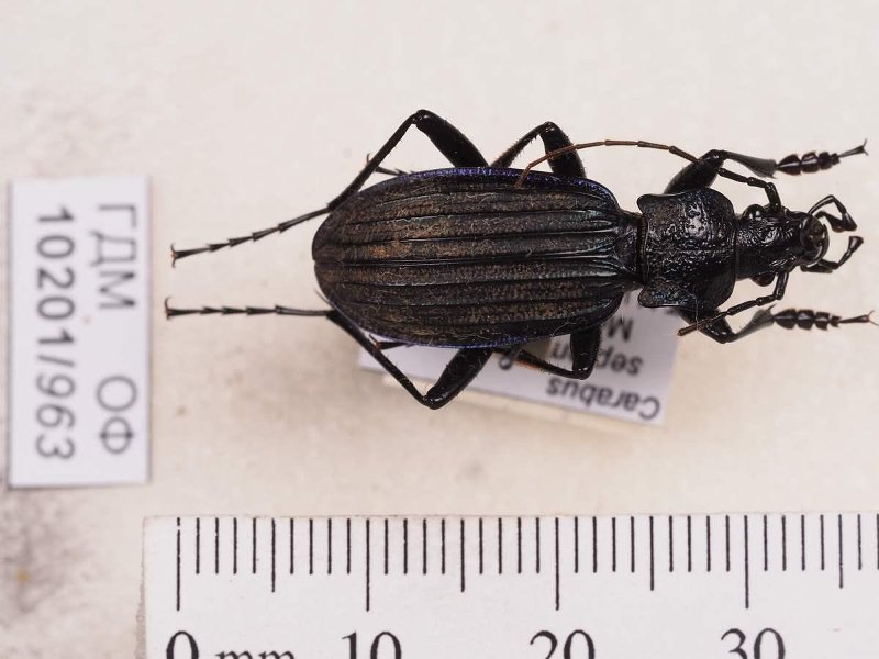 Сухое насекомое. Жук жужелица. Carabus septemcarinatus Motschulsky, 1840. Классификация: Членистоногие Arthropoda, Насекомые Insecta, Жуки Coleoptera, Жужелицы Carabidae