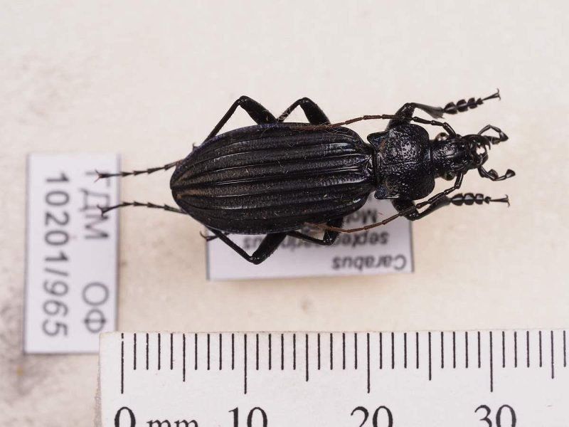 Сухое насекомое. Жук жужелица. Carabus septemcarinatus Motschulsky, 1840. Классификация: Членистоногие Arthropoda, Насекомые Insecta, Жуки Coleoptera, Жужелицы Carabidae