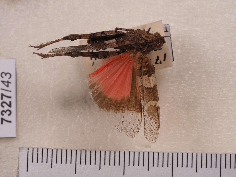 Сухое насекомое. Кобылка. Oedipoda miniata (Pallas, 1771). Классификация: Членистоногие Arthropoda, Насекомые Insecta, Прямокрылые Orthoptera, Саранчовые Acrididae