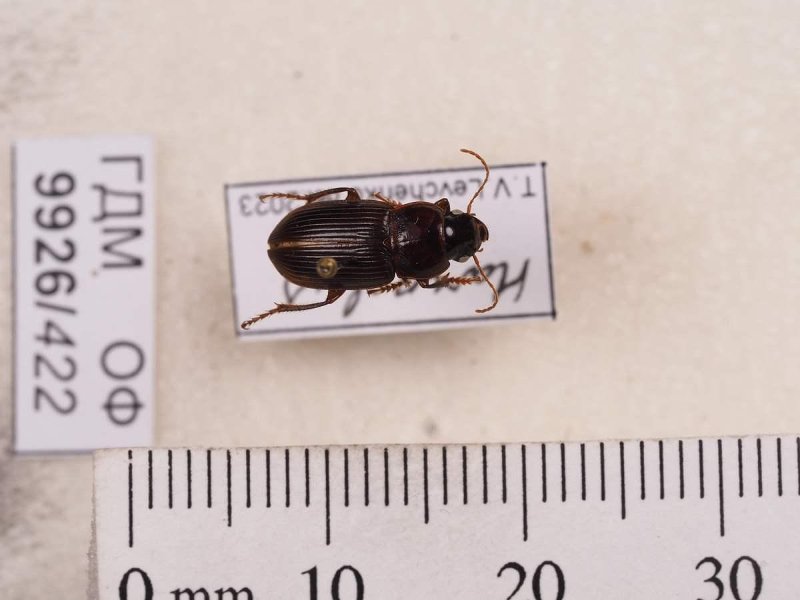 Сухое насекомое. Жук птеростих. Harpalus. Классификация: Членистоногие Arthropoda, Насекомые Insecta, Жуки Coleoptera, Жужелицы Carabidae, Carabus, Жук C. coriaceus Linne, 1758