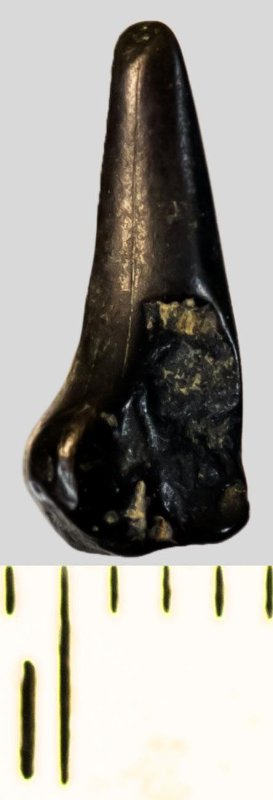 Зуб (фрагмент). Акула. Lamniformes gen. et sp. indet. Классификация: Хордовые Chordata, Позвоночные Vertebrata, Хрящевые рыбы Chondrichthyes, Пластиножаберные Elasmobranchii