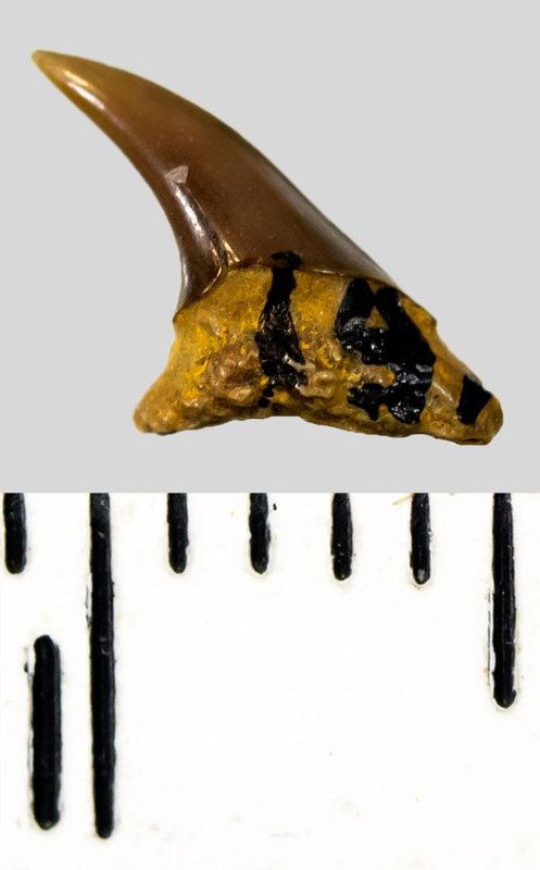 Коронка мелкого бокового зуба темно-охристого цвета, режущего типа, S-образно изогнутая, с гладким режущим краем. Корень охристый, сильно окатанный, сохранился фрагментарно.