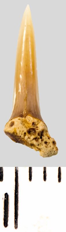 Зуб. Акула. Eostriatolamia subulata (Agassiz, 1843). Классификация: Хордовые Chordata, Позвоночные Vertebrata, Хрящевые рыбы Chondrichthyes, Пластиножаберные Elasmobranchii, Акулы Selachii, Ламнообразные Lamniformes, Песчаные акулы Odontaspididae