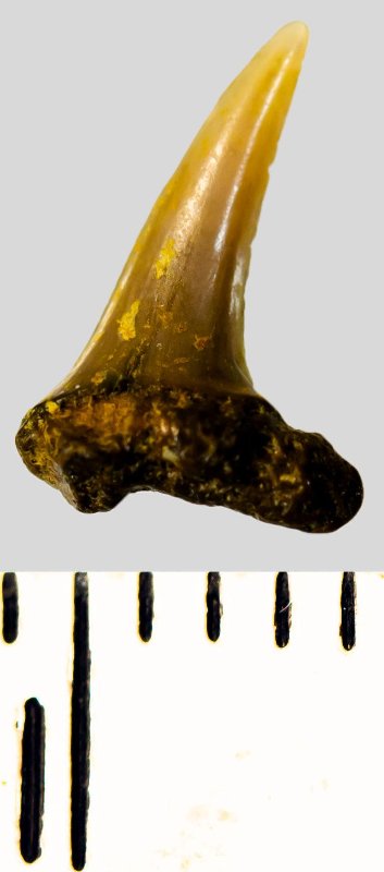 Мелкий боковой зуб с коронкой рыжевато-бежевого цвета, колюще-режущего типа, S-образно изогнутой, с гладким режущим краем. С лингвальной стороны у основания коронки на эмали имеется скульптура в виде слабой продольной струйчатости. Корень бурый, арочный, умеренно массивный, со следами окатанности, левая ветвь утрачена. Имеется одна питательная борозда с лингвальной стороны корня. Добавочные зубцы коронки зуба отсутствуют.