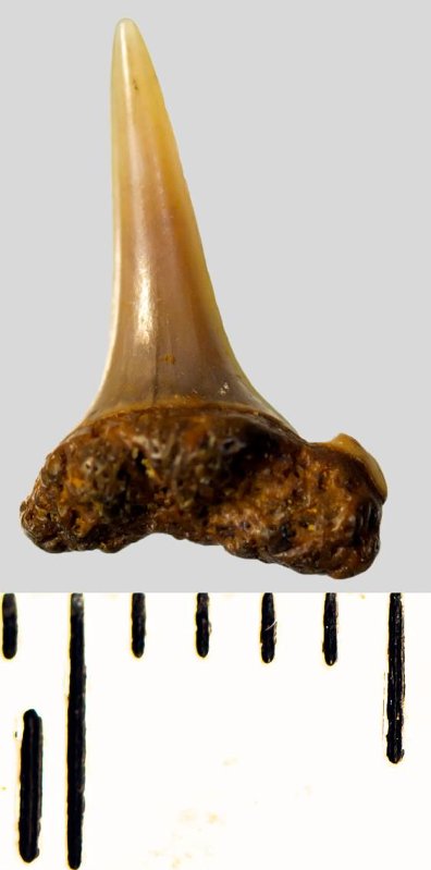Мелкий боковой зуб с коронкой рыжевато-бежевого цвета, колюще-режущего типа, S-образно изогнутой, с гладким режущим краем. С лингвальной стороны у основания коронки на эмали имеется скульптура в виде слабой продольной струйчатости. Корень бурый, арочный, умеренно массивный, со следами окатанности, левая ветвь утрачена. Имеется одна питательная борозда с лингвальной стороны корня. Добавочные зубцы коронки зуба отсутствуют.