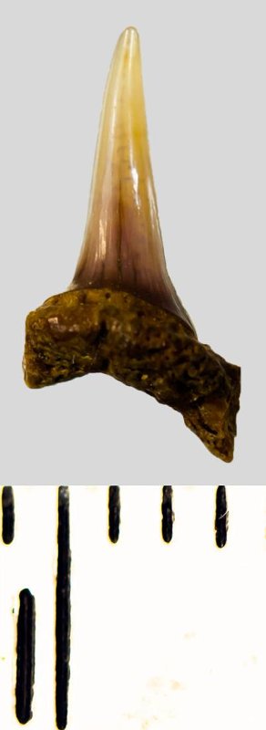 Мелкий боковой зуб с коронкой рыжевато-бежевого цвета, колюще-режущего типа, S-образно изогнутой, с гладким режущим краем. С лингвальной стороны у основания коронки на эмали имеется скульптура в виде слабой продольной струйчатости. Корень бурый, арочный, умеренно массивный, со следами окатанности, левая ветвь утрачена. Имеется одна питательная борозда с лингвальной стороны корня. Добавочные зубцы коронки зуба отсутствуют.