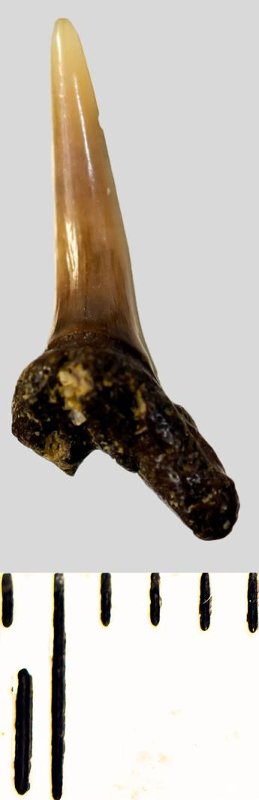 Мелкий боковой зуб с коронкой рыжевато-бежевого цвета, колюще-режущего типа, S-образно изогнутой, с гладким режущим краем. С лингвальной стороны у основания коронки на эмали имеется скульптура в виде слабой продольной струйчатости. Корень бурый, арочный, умеренно массивный, со следами окатанности, левая ветвь утрачена. Имеется одна питательная борозда с лингвальной стороны корня. Добавочные зубцы коронки зуба отсутствуют.