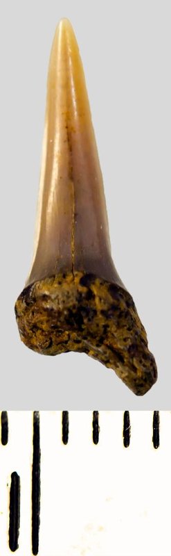 Зуб. Акула. Eostriatolamia subulata (Agassiz, 1843). Классификация: Хордовые Chordata, Позвоночные Vertebrata, Хрящевые рыбы Chondrichthyes, Пластиножаберные Elasmobranchii, Акулы Selachii, Ламнообразные Lamniformes, Песчаные акулы Odontaspididae