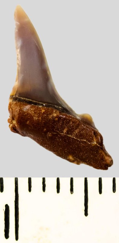 Зуб (фрагмент). Акула. Lamiostoma vincenti (Winkler, 1876). Классификация: Хордовые Chordata, Позвоночные Vertebrata, Хрящевые рыбы Chondrichthyes, Пластиножаберные Elasmobranchii