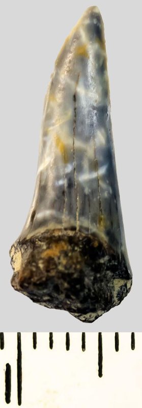 Зуб (фрагмент). Акула. Lamiostoma vincenti (Winkler, 1876). Классификация: Хордовые Chordata, Позвоночные Vertebrata, Хрящевые рыбы Chondrichthyes, Пластиножаберные Elasmobranchii